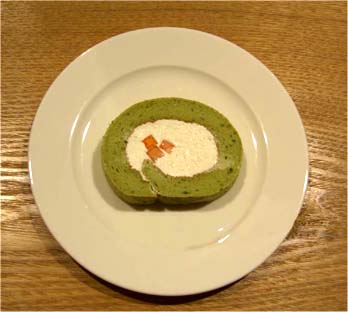 このホールを6当分に切り分けますから、お客様には白と茶のどちらかが少し多くなった一切れが届くようになります。皮付きの食感も楽しんでいただけるようにと、こんな配列にしてみました。